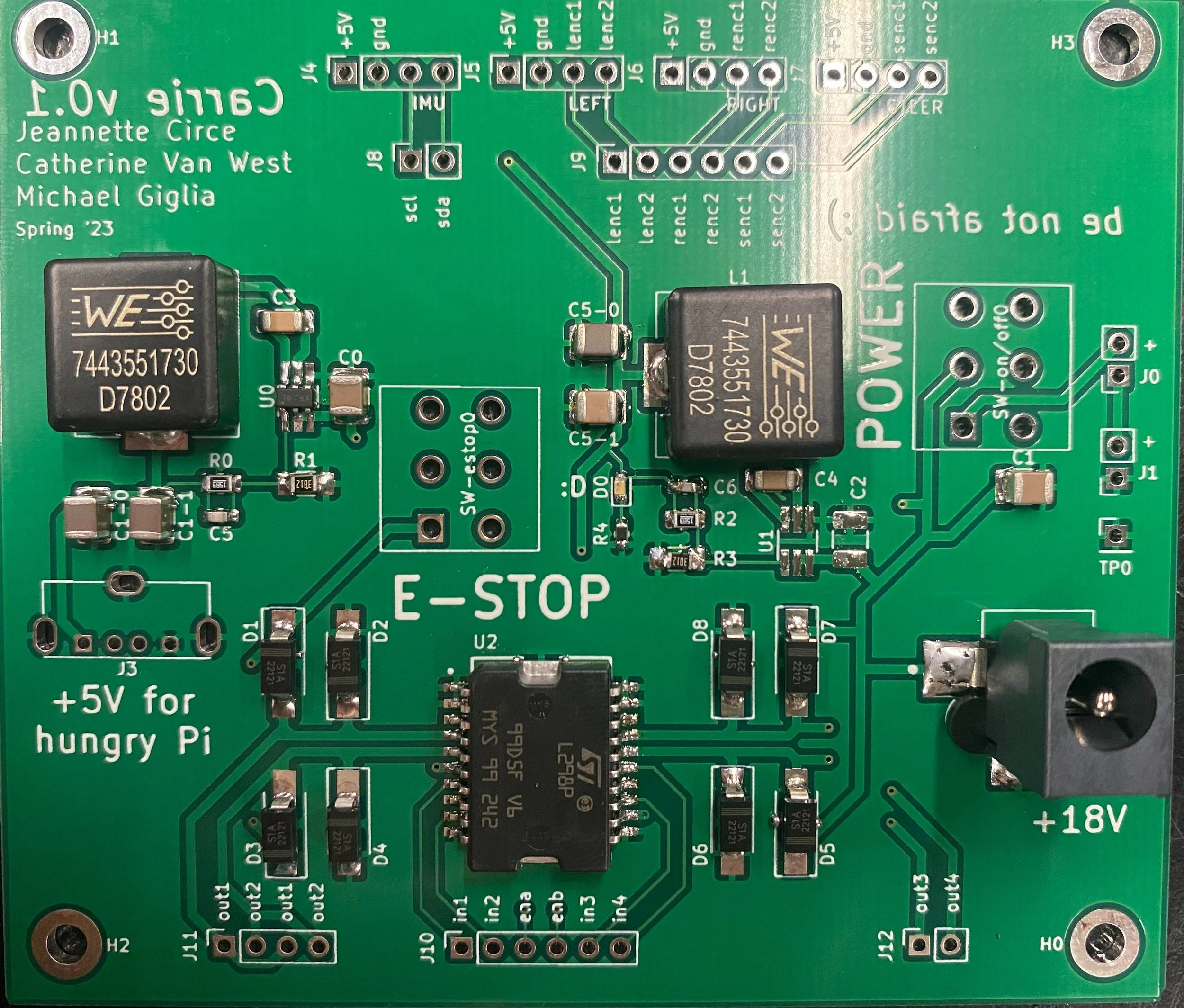 The vehicle was controlled with a Raspberry Pi and Arduino MEGA. The Raspberry Pi used the vehicle state and computed the path-following steering angle and speed. These commands were sent to the Arduino via Serial Communication Protocol. The Arduino then controlled the steering and drive motors with PID controllers with PWM signals sent to an L298 chip. All of the sensors, power management, and motor drivers were on an external board designed by another group of students and lab technicians. This board was assembled by hand and solder-paste and soldered with an oven. The initial plan was to power the car with two 9V batteries, however, the current draw of the motor required the car to be tethered by a power cord to run for extended time periods during extensive testing.