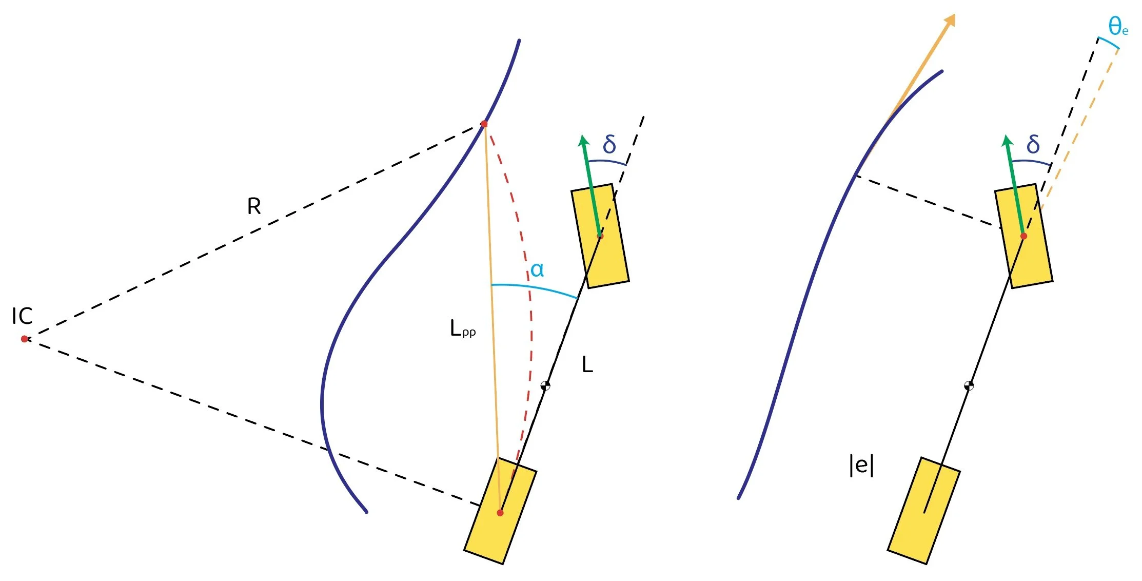 The two geometric controllers that were compared to a model-predictive controller (MPC) are pure-pursuit and Stanley. Pure-pursuit calculated the desired steering angle based on a lookahead distance that sees a forward point on the planned path and the angle error between that point and the vehicle’s heading. The Stanley controller uses the cross-track error between the planned path and the front-wheel position of the vehicle and the difference in vehicle heading and nearest point tangency.